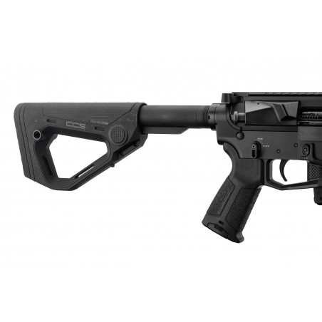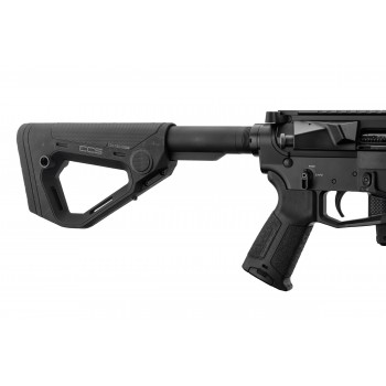 Le lower LS040 est équipée d’une crosse HERA ARMS CCS ajustable en longueur sur tube MILSPEC à verrouillage automatique et deux emplacements de bretelle type Quick Detach ainsi q’un rail picatinny amovible permettant l’utilisation d’un mono pied.