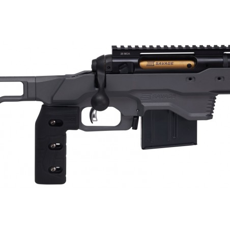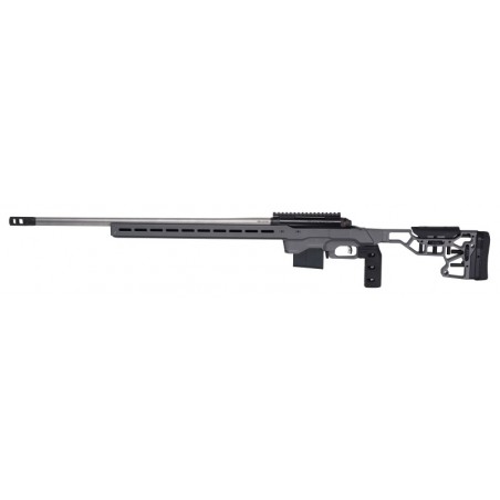 Châssis MDT ACC aluminium avec crosse entièrement réglable. Rail ARCA le long du châssis. Boîtier target inox avec revêtement nitride. Corps de culasse revêtement titane. Détente Accu Trigger personnalisable de 1,5 à 4 lb. Frein de bouche. Poignée verticale MDT. Chargeur standard AICS.